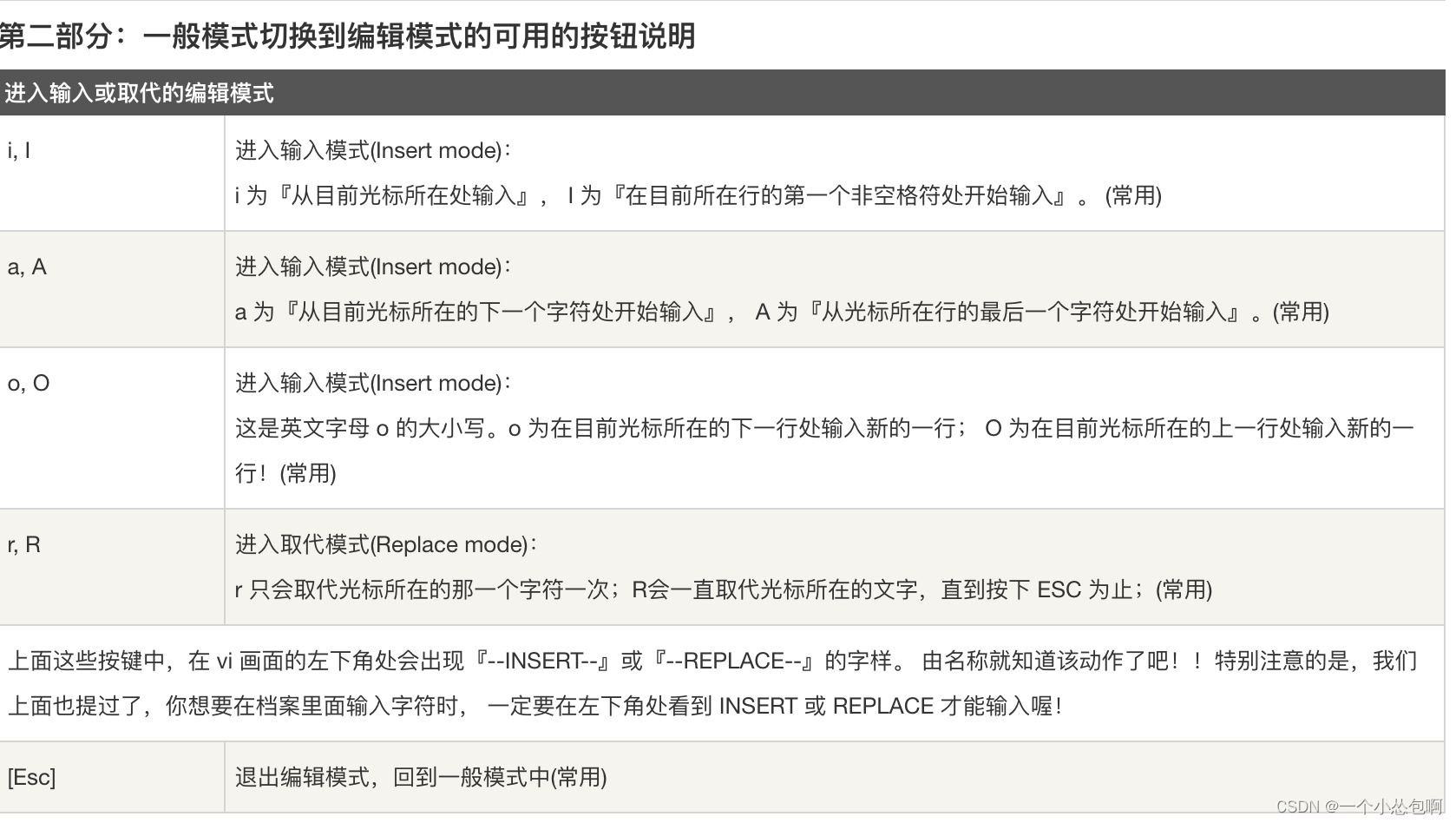 基本上 vi/vim 共分为三种模式,分别是命令模式(Command mode),输入模式(Insert mode)和底线命令模式(Last line mode)。 这三种模式的作用分别是: