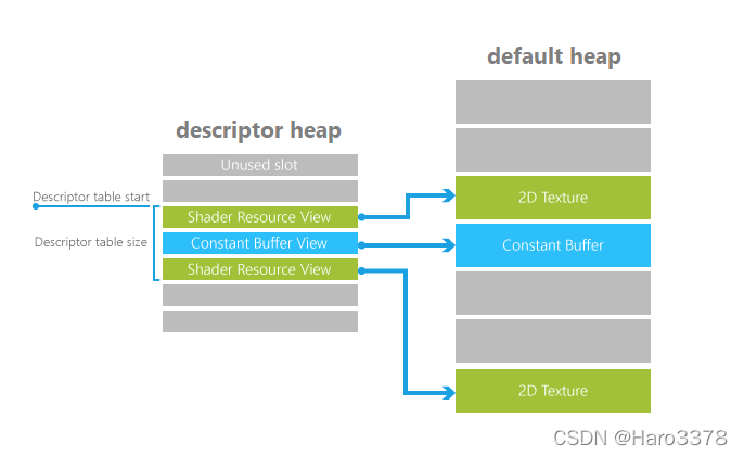 可以看出描述符是用于资源绑定的,微软在D3D12中为资源绑定添加了新的概念,包括descriptors, descriptor tables, descriptor heaps,和 root signatures,接下来我们依次介绍。(因为这些概念会相互关联,所以建议至少阅读两次来关联上下文理解)