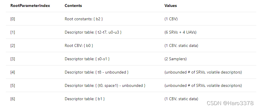 这里有一个使用技巧,根参数本质上是一块可以在 GPU 中访问的内存,每个 Draw\Compute 之间修改的根参数都会被驱动或硬件保存一份单独的数据,这被称为根参数的版本控制。所以如果根参数比较大,而每次改动比较小,会造成大部分没有变动的数据冗余保存,增加了硬件开销。有些硬件会比较优化的存储这些改动,减少不变的部分的冗余。另外,硬件为了保证 API 的绘制语义正确,当根参数超出硬件存储的大小时,会溢出到更慢的系统内存或硬件内部的其它更慢的存储机制(溢出访问成本加1),这种情况下如果能将频繁变化的 RP 保存在的 RP 溢出范围内,则能极大程度上减少由于溢出访问更慢存储而造成的开销,这也就是 D3D12 建议将频繁变化的 RP 尽可能的设置在靠近 RP 堆头部最本质的原因。