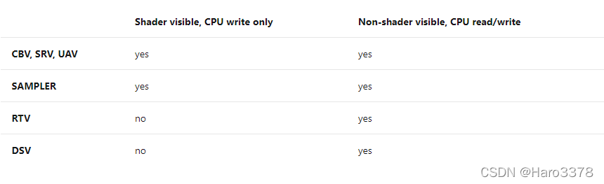 首先,放在GPU描述符堆中的描述符称为GPU Descriptors,只能用来存储SRV/CBV/UAV/SAMPLER,因为这些资源在gpu中的shader可以直接引用,也可以称Shader Visible。