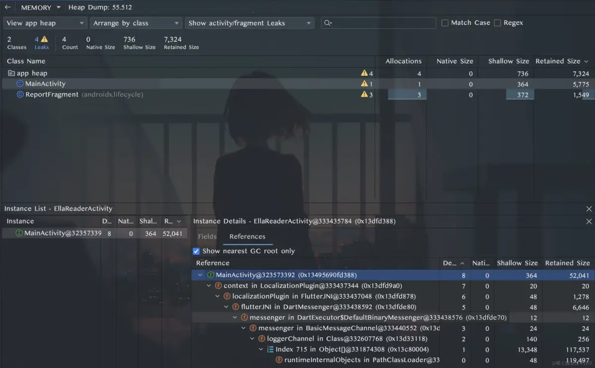 这个activity是一个二级页面,使用多引擎方案,在上面跑了一个 FlutterView ;看样子是一个『单实例』的内存泄漏,即无论开关多少次,Activity 只会保留一个实例在heap中无法释放,常见的场景是全局静态变量的引用。这种内存泄漏对内存的影响比多实例泄漏略轻一点,但如果这个 Activity 体量很大,持有较多的 Fragment、View,这些相关组件一起泄漏的话,也是要着重优化的。