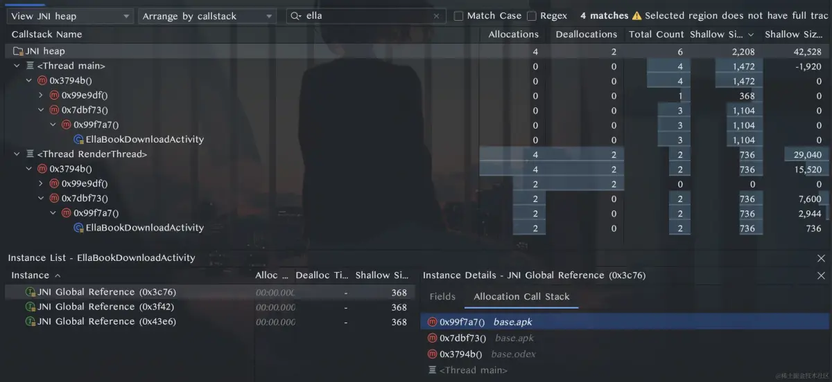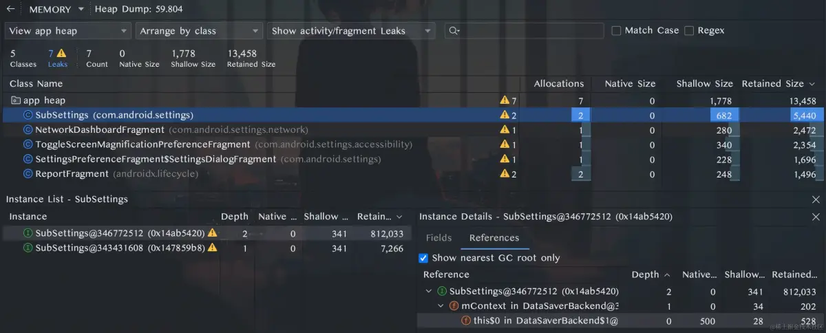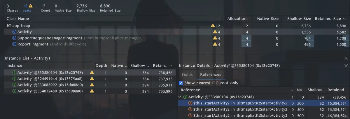 我们用动态分析工具 Allocations Record 看一下 Java 类在 Native 堆的引用,果然发现了这个 Activity 的一些引用链: