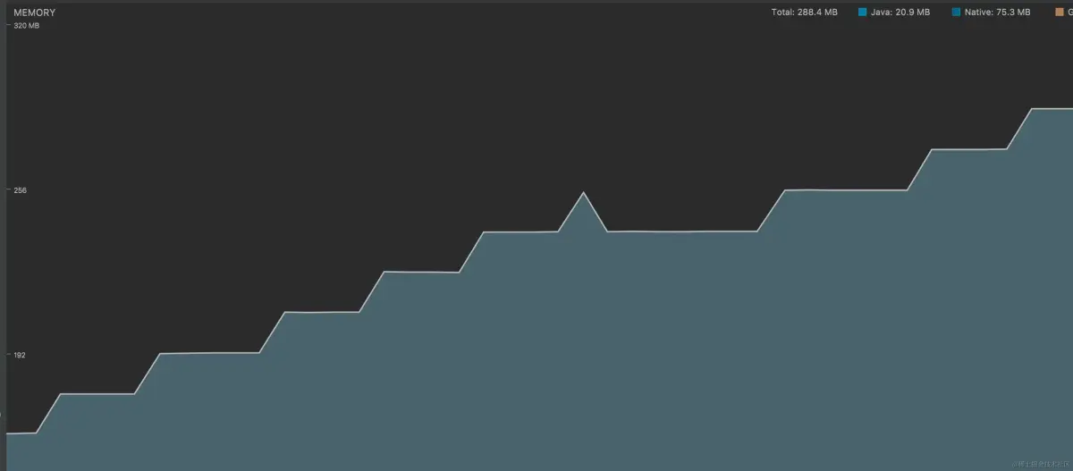 内存泄漏出现时,内存曲线典型的现象就是呈现阶梯状,一旦上升则难以下降;例如 Activity 泄漏后,反复打开、关闭页面内存占用会一路上升,并且点击垃圾桶图标手动GC后,占用量无法下降到打开 Activity 之前的水平,这时大概率出现内存泄漏了。