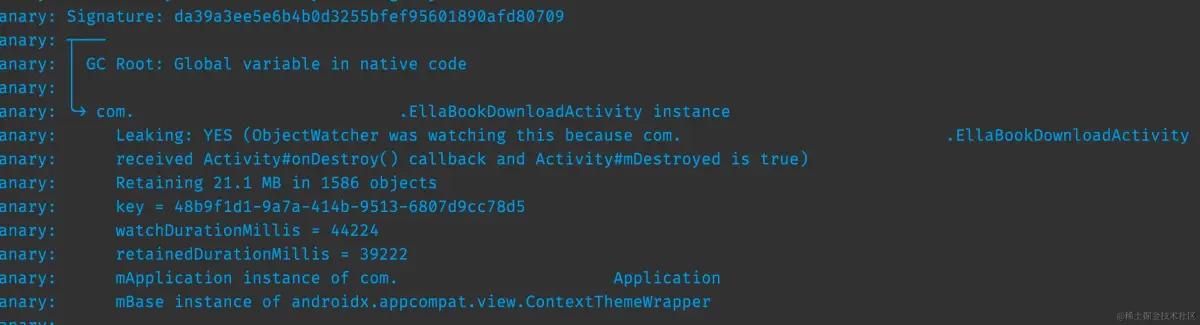 但可惜引用链都是一些内存地址,没有显示类名,没法知道是何处引用到了 Activity;后面用 LeakCanary 试了一下,虽然也明确说明了是 Native 层 Global Variable 的引用造成的内存泄漏,但还是没有提供具体的调用位置;