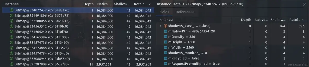 Allocations:堆内存中该类的实例个数;Native Size:该类所有实例引用到的Native对象所占内存Shallow Size:该类所有实例自身的实际内存占用大小,不包括其所引用到的对象的内存占用大小;Retained Size:与Shallow Size不同,这个数字代表该类所有实例及其所有引用到的对象的内存占用大小;