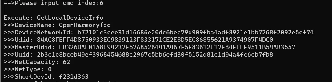 - A 端(或 B 端)执行 6 - GetLocalDeviceInfo,查看本端 NetworkId 值。
