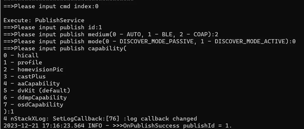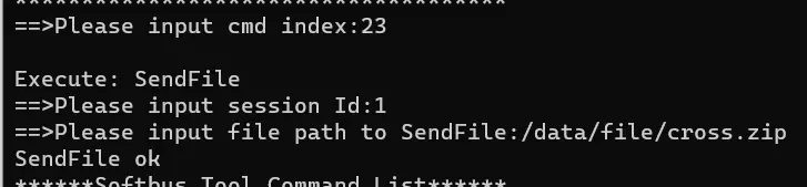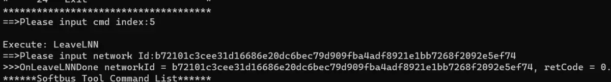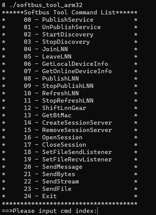 3.在 hdc shell 界面执行,会显示 Softbus Tool Command List 命令列表,选择接口前面的序号即可执行相应的接口,有些接口在执行时,需要用户输入参数来实现不同的场景, 这些在下文演示部分做了示例。