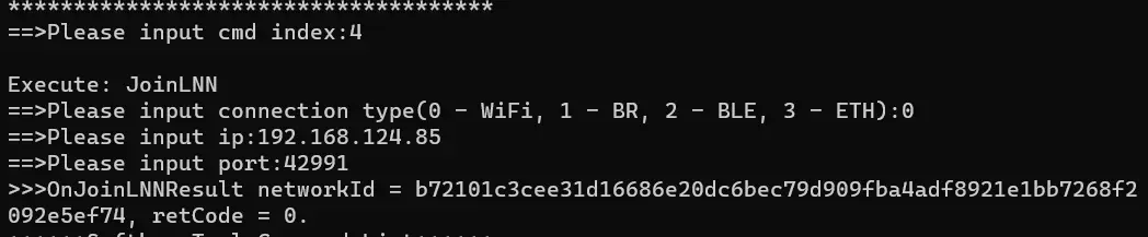 - B 端(或 A 端)执行 6 - GetLocalDeviceInfo,查看本端 NetworkId 值。