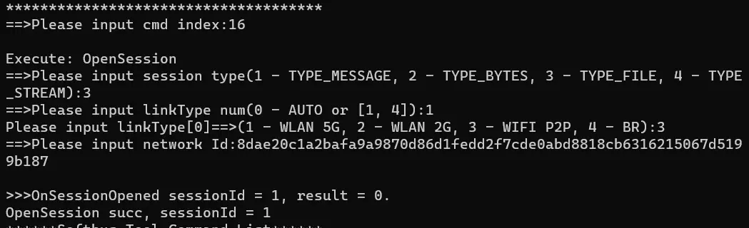 - A 端(或 B 端)执行 16 - OpenSession,打开会话。