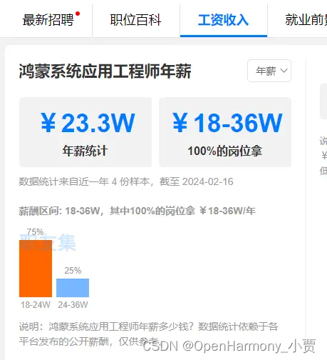 自从华为说鸿蒙不再兼容Android,很多互联网公司都抢着和鸿蒙原生开发合作,还在招聘网站上贴出了很多鸿蒙开发的岗位。这些岗位的薪资,比一些传统的开发岗位还要高呢!根据职友网的数据,2024年1月,鸿蒙相关岗位的平均年薪达到了23.3万元,比市场的平均水平要高很多。而且,随着招聘市场的火爆,这些岗位的薪资可能还会涨。