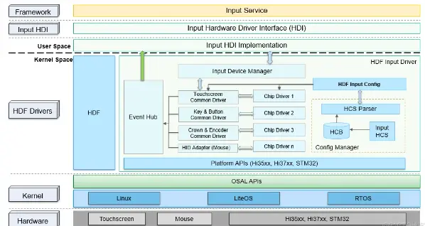 鸿蒙基于input驱动模型开发touchscreen器件驱动。Input驱动模型基于HDF驱动框架、PLATFORM接口、OSAL接口进行开发,向上对接规范化的驱动接口HDI(Hardware Driver Interface)层,通过Input-HDI层对外提供硬件能力,即上层input service可以通过HDI接口层获取相应的驱动能力,进而操控touchscreen等输入设备。