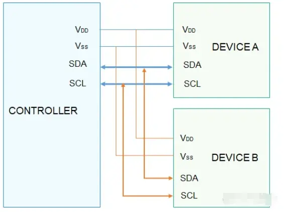 - I2C以主从方式工作,通常有一个主设备和一个或者多个从设备,主从设备通过SDA(SerialData)串行数据线以及SCL(SerialClock)串行时钟线两根线相连,如下图所示。