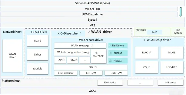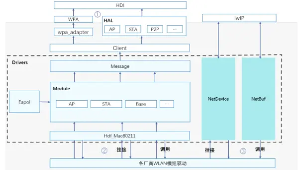 - WLAN是基于HDF(Hardware Driver Foundation)驱动框架开发的模块,该模块可实现跨操作系统迁移,自适应器件差异,模块化拼装编译等功能。各WLAN厂商驱动开发人员可根据WLAN模块提供的向下统一接口适配各自的驱动代码,实现如下能力:建立/关闭WLAN热点、扫描、关联WLAN热点等;对HDI层向上提供能力如下:设置MAC地址、设置发射功率、获取设备的MAC地址等。