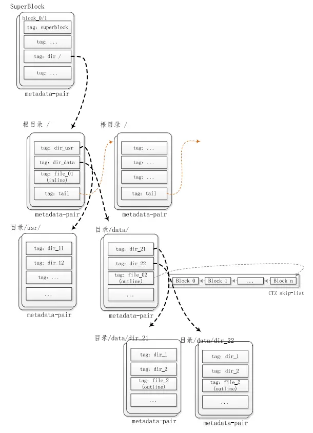 文件系统存储结构信息基本以SuperBlock为开端,然后寻找到文件系统根节点,再根据根节点,逐步拓展成一个文件系统树形结构体。littlefs也与此类似,以SuperBlock和根目录为起点,构建了一个树形存储结构。不同的是littlefs的根(“/”)直接附加在SuperBlock之后,与其共享元数据对(metadata pair)。littlefs中目录或者文件都是以该根节点为起点,构建了与其他文件系统类似的树形结构。