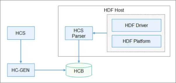 HCS经过HC-GEN编译生成HCB文件,HDF驱动框架中的HCS Parser模块会从HCB文件中重建配置树,HDF驱动模块使用HCS Parser提供的配置读取接口获取配置内容。