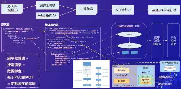 ArkUI 的运行机制如图所示。其中,以 ArkTS 语言开发的源代码,经过编译工具链和 ArkUI 框架 API 编译,形成中间代码,再通过方舟运行时形成 ArkUI 框架运行时。在整个渲染设计上,ArkUI 提供了扁平化渲染管线、按需渲染、数据绑定以及基于 PGO 的 AOT 等创新能力,提升用户体验以及渲染效率。在跨设备的设计上,ArkUI 提供了响应式组件+响应式能力的响应式布局能力以及自适应组件+自适应能力的自适应布局能力,并且在视觉交互侧也通过分层参数和主题风格、多态组件以及交互归一等进行了交互能力的增强。此外,ArkUI 支持部署至百 K 级、M 级的轻量化设备,通过引擎轻量化改造以及基于目标平台进一步轻量化定制,实现跨设备能力适配。