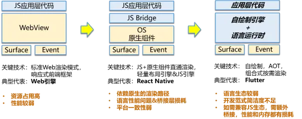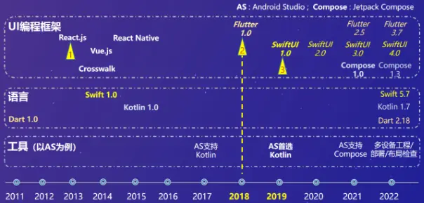 近十年来,业界 UI 编程框架围绕着更好的开发效率,更好的运行体验以及适应更多的平台不断发展演进。其中有三个关键的时间节点: