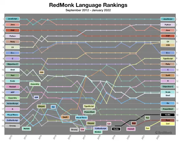 如图所示的排行榜显示了在 2012 年至 2022 年的区间里,最活跃、热度最高的前 20 名编程语言,由图可以看出 JavaScript 和 TypeScript 的排名是遥遥领先的,本身拥有非常好的生态基础。但是,JavaScript 和 TypeScript 也有一定的缺陷,比如缺失基于类型系统的运行时优化,AOT 能力,精细化类型以及细粒度的并行化等。