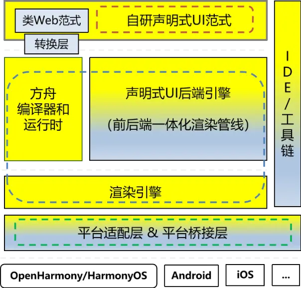 ArkUI 整体架构如图所示。最上层提供了自研声明式 UI 范式,也支持类 Web 范式;中间层为方舟编译器和运行时、声明式 UI 后端引擎以及渲染引擎,下层为平台适配层和平台桥接层。此外,ArkUI 开发框架还配套了相应的 IDE 开发工具以及工具链,提升开发体验。