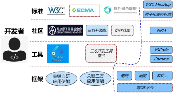 4. 标准。这层主要是通过标准化的参与,来构建中长线影响力。包括 W3C 相关的标准组织(ArkUI 类 Web 范式的进一步标准化,WebAssembly 的融合探索等),ECMAScript 标准组织(ArkTS 的增强语言特性的进一步标准化等),软件绿色联盟(应用质量标准,原子化服务标准的完善/互通等)。