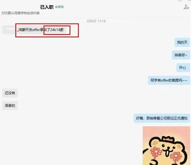 由于是在职程序员,小刘首选线上课程,综合对比之后,选择了码牛课堂。小刘表示,最大的优势在于不用脱产,在线学习,无论是性价比、品牌口碑还是授课老师的专业程度,都是市场上性价比最高的!经过两个月的学习,小刘凭借相关工作经验和扎实的鸿蒙技术能力,成功获得一家互联网中大厂的鸿蒙开发offer,薪资为24K * 14薪!