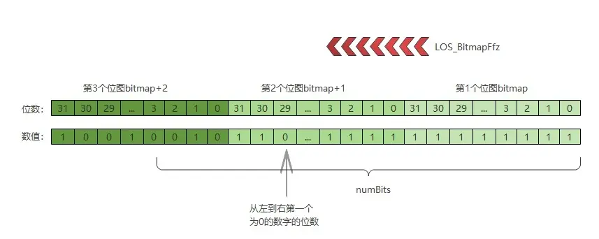 我们接着看下函数LOS_BitmapFfz()的代码。⑴处根据位数numBits计算出对应的状态字的数量,然后依次循环每一个状态字,⑵处如果状态字全为1,则继续循环,否则执行⑶。执行到⑶说明,,前面有i个状态字的各个位全为1。i * BITMAP_BITS_PER_WORD + Ffz(bitmap[i])就表示各个状态字的二进制位中,从左到右第一个0的位置。⑷处如果获取的位数小于第二个参数,则返回获取的位数,否则返回-1。如下图所示: