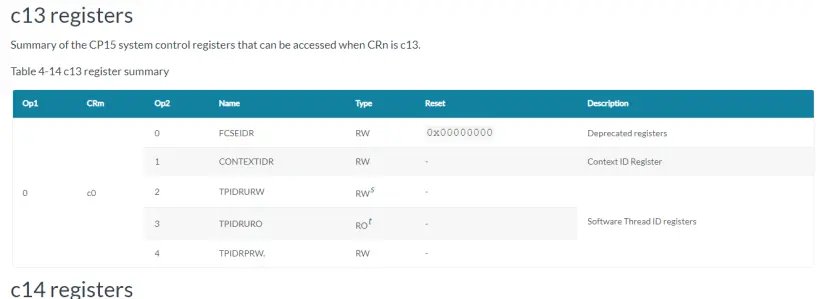 __asm__ volatile("mrc p15, 0, %0, c13,c0,1" : "=r"(val));