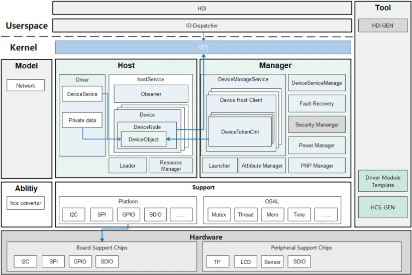 如下图,开源鸿蒙系统驱动框架HDF在内核中的实现,可以分为向用户层提供设备服务的管理模块(Manager),和实际管理硬件的Host模块。
