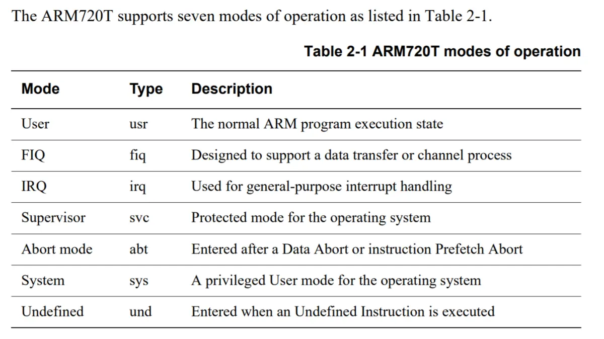 未定义模式(und):未定义模式用于支持硬件协处理器的软件仿真,CPU在指令的译码阶段不能识别该指令操作时,会进入未定义模式。