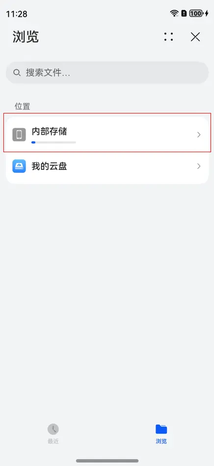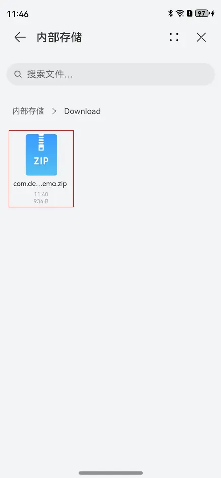 - 在设备文件管理界面,单击“浏览”按钮,进入浏览手机内部存储界面。单击“内部存储”,根据之前导入数据的路径,进入手机存储的相应路径,选择需要导入的APK应用数据zip包。