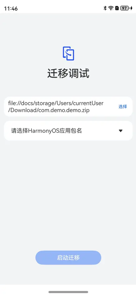 - 单击需要导入的APK应用数据zip包后,会返回“迁移调试”工具首页,已选择的需要导入的APK应用数据会显示在第一栏中。