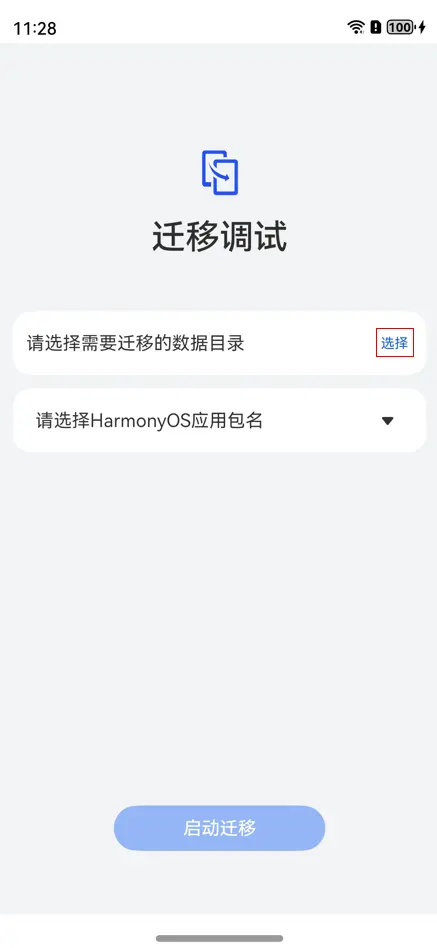 - 在“迁移工具”应用的首页,开发者通过单击“选择”按钮进入设备文件管理界面。