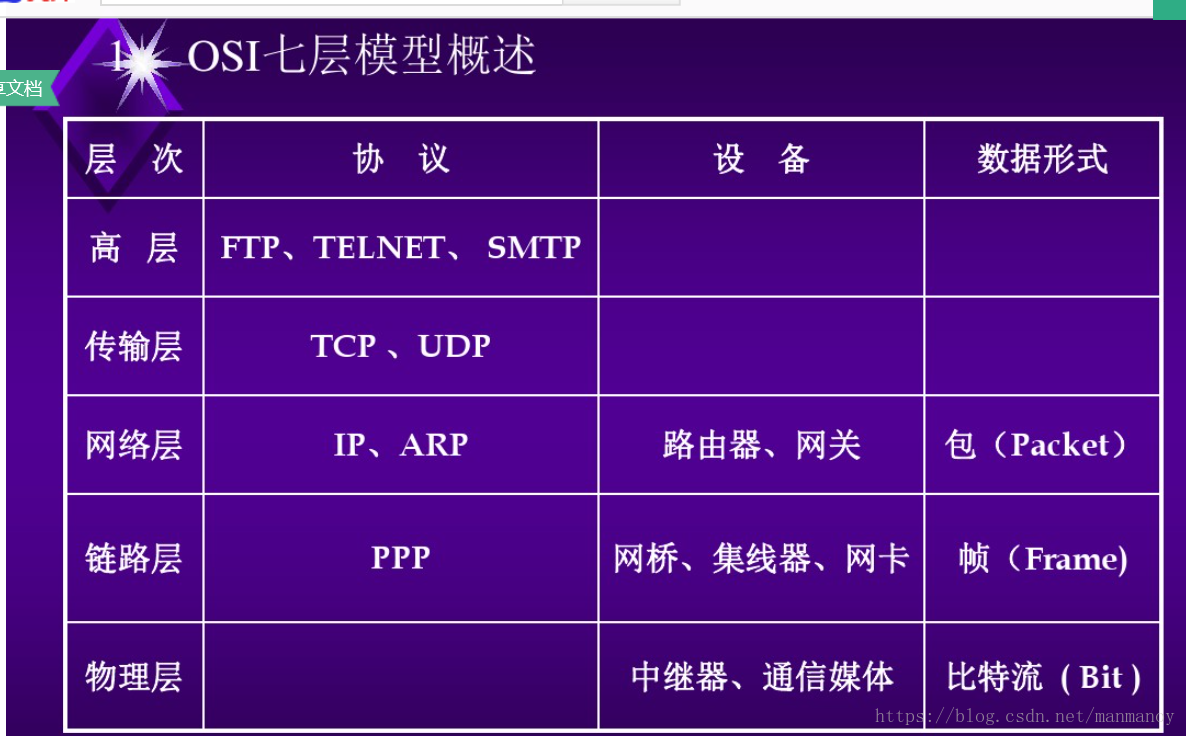 应用层:网络服务与最终用户的一个接口。协议有:HTTP FTP TFTP SMTP SNMP DNS