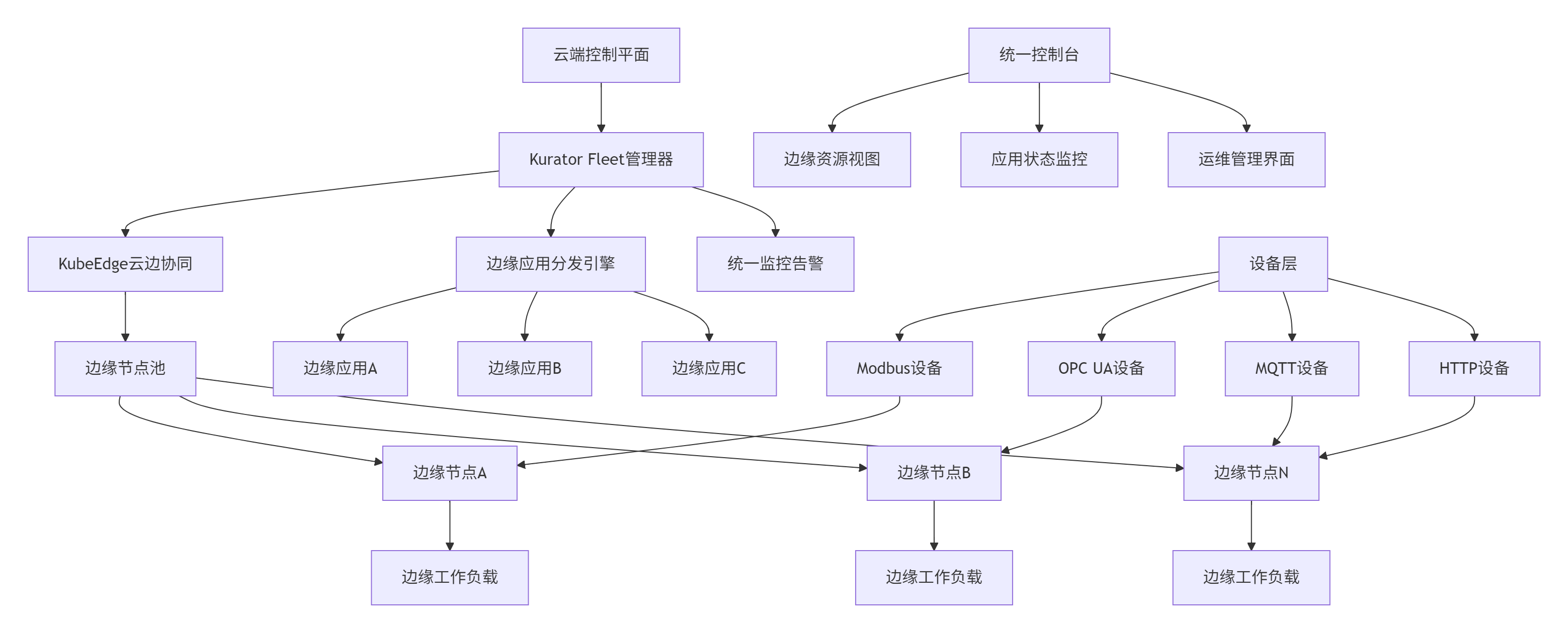 Kurator的创新之处在于其"云边端一体化协同"架构设计。与简单的工具堆砌不同,Kurator通过深度整合KubeEdge、K3s等主流边缘计算项目,提供了真正的端到端边缘计算解决方案。