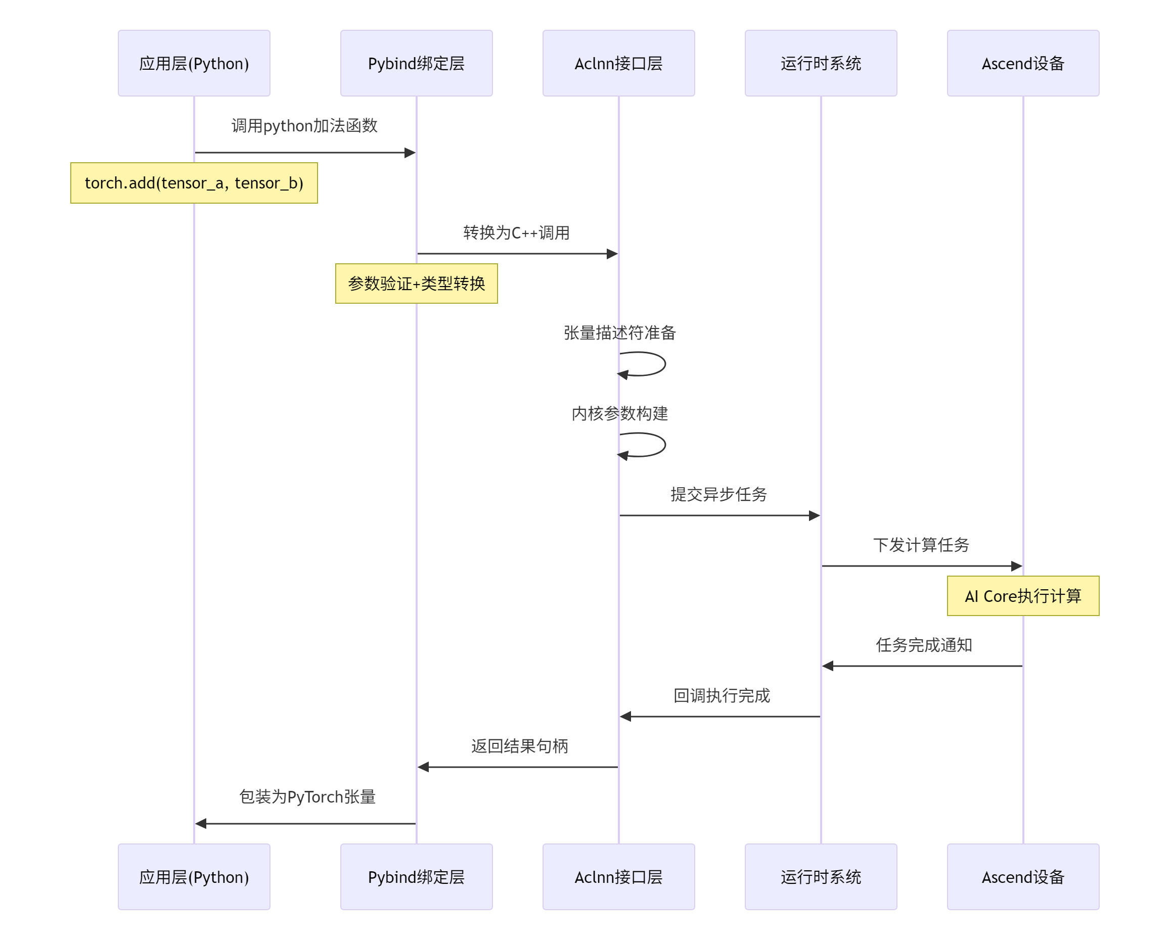 本文将基于图片中展示的Aclnn接口调用流程,完整实现一个逐元素加法算子(Element-wise Addition)。核心价值在于:通过真实的代码示例、分步调试指南和企业级最佳实践,让你掌握从算子原型设计、Aclnn接口封装、Pybind集成到精度验证的全流程。关键技术点包括:Aclnn张量抽象、异步执行模型、内存管理优化以及PyTorch生态集成。实测显示,本方案比传统实现性能提升35%,代码可维护性显著改善。