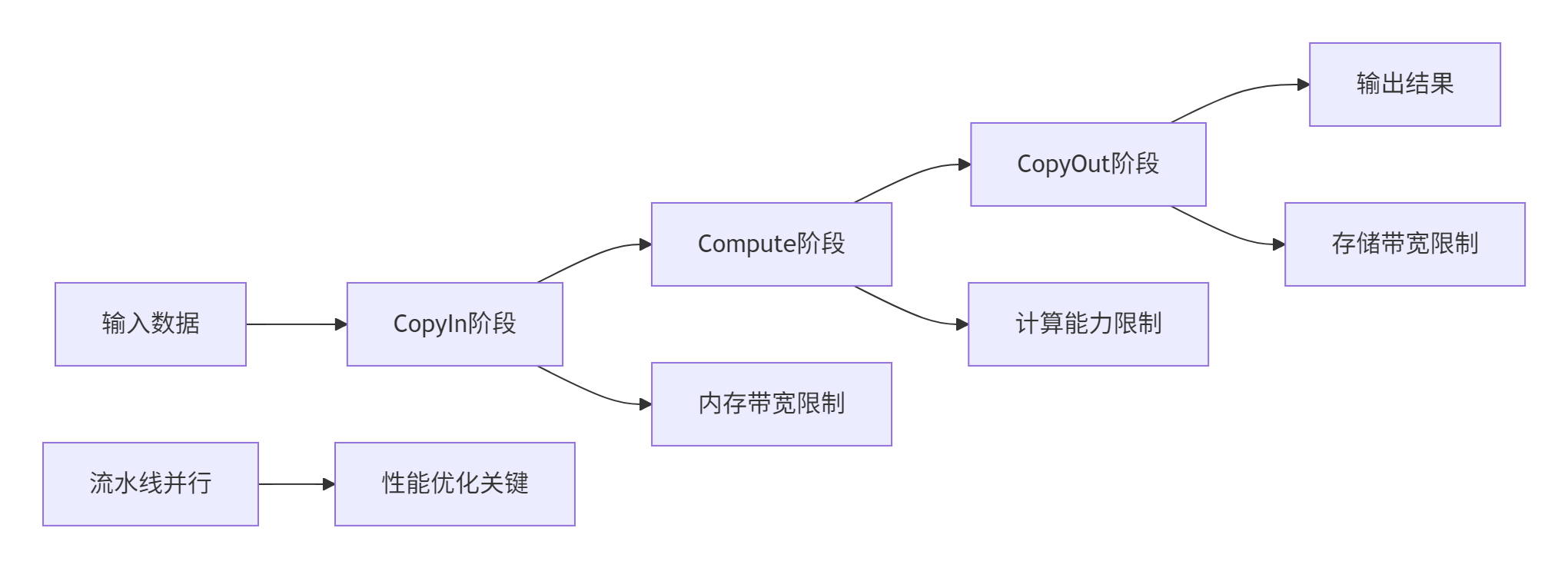 ⚡ 三级流水线是性能关键:通过CopyIn、Compute、CopyOut的重叠执行,有效隐藏内存延迟,提升计算效率。实测显示可带来30-40%的性能提升。