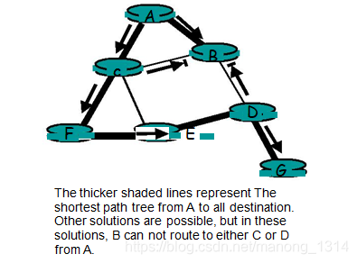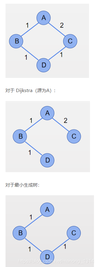 设加粗的路径是 A 的最小生成树。 这时 B 将收到来自 A、C、D 的广播报文。