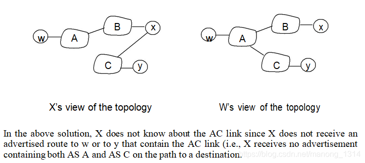 A 向 B 通告两个路由:AS-PATH 为 A-W 和 A-V