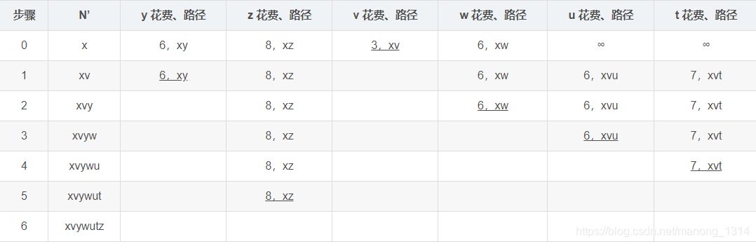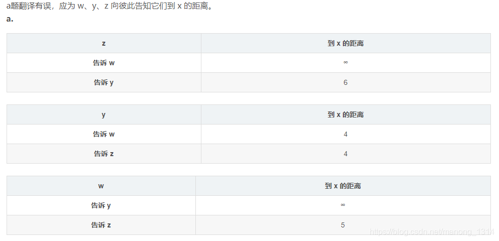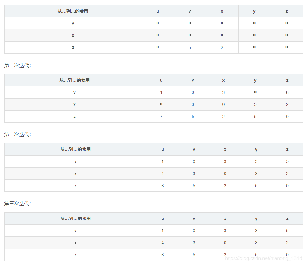不会改变,因为初始表中通过 B 到 z 跳数是 7,然而来自 A 的通告到 z 需要 11 跳,因此表不会改变。