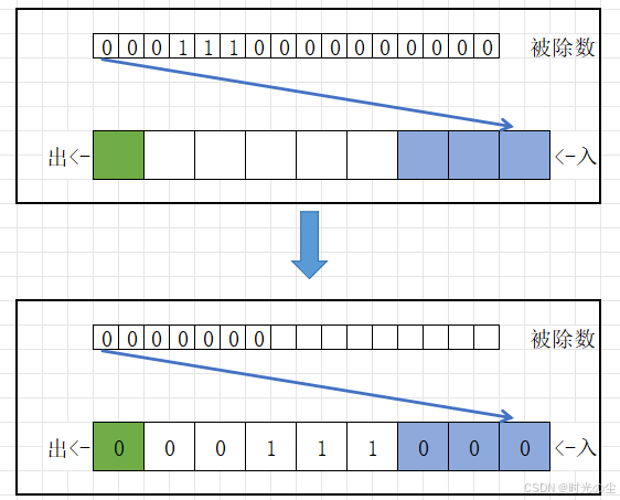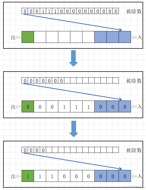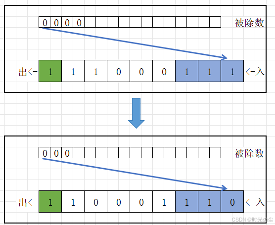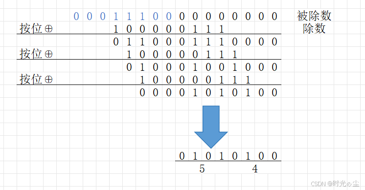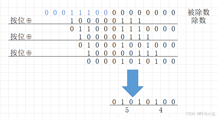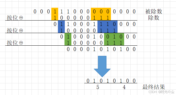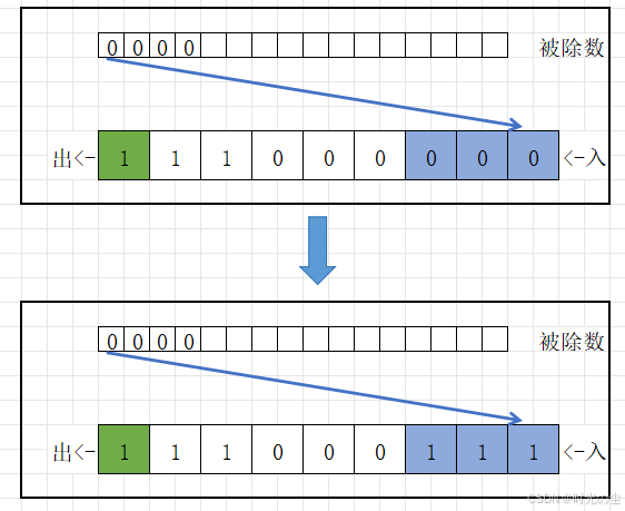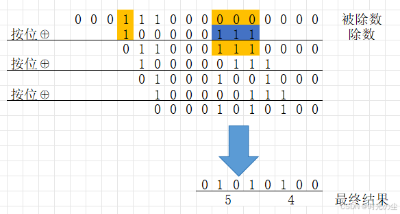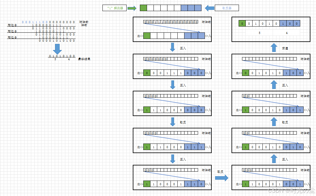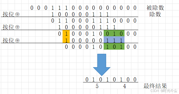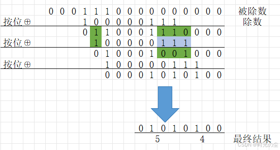 ② 异或:如果对齐后的被除数部分当前最高位是1,则在该步的商记1,并用除数对当前被除数部分进行模2减法(XOR)。