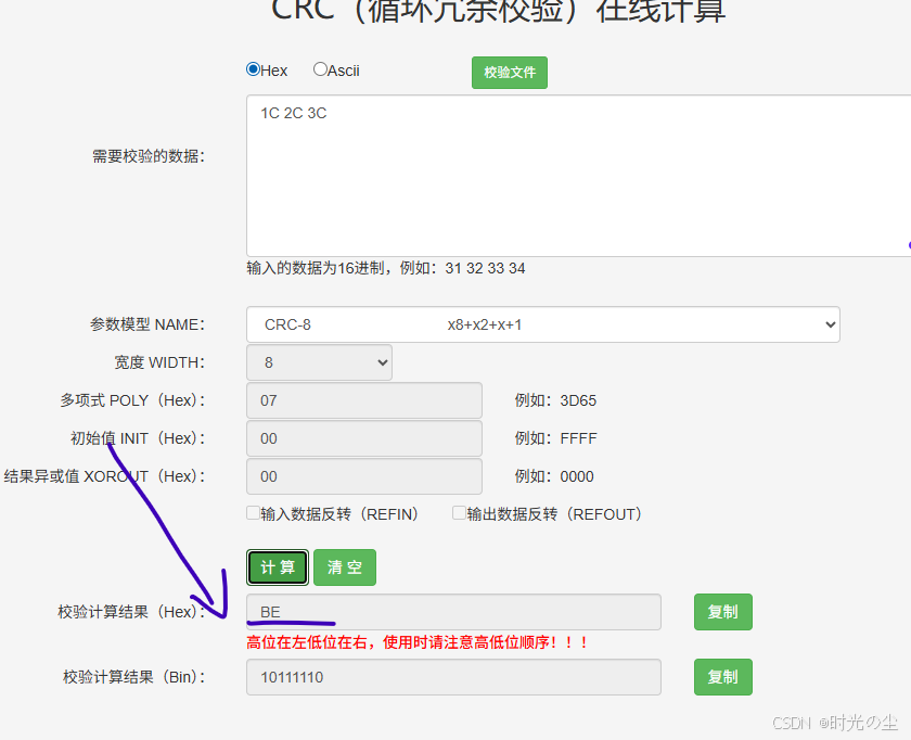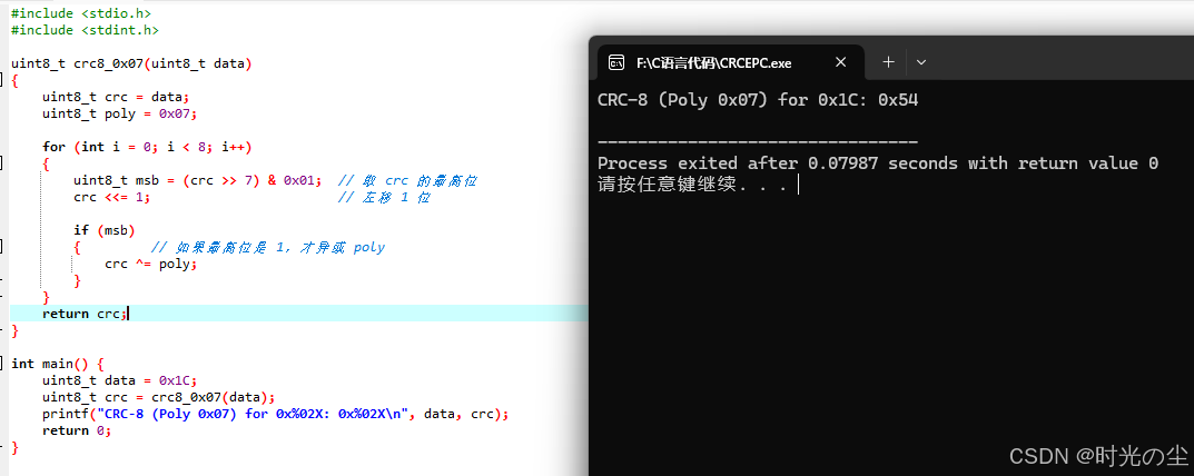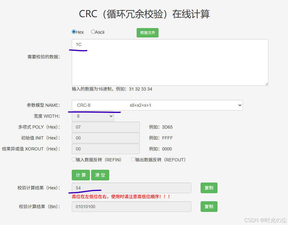 上面我们编写了CRC-8的代码,但是在实际使用过程在,上述代码其实是不规范,首先,在我们上面给出的常见的CRC模型中,可以看出CRC的初始值是0x00,而我们上面代码并没有初始值这一项,除此之外,需要遵循MSB(最高有效位优先)的处理方式,我们直接去的全是我们运算器值的最高位,这样做也不能说错,但是对于实际使用更改其他模型不是很方便。