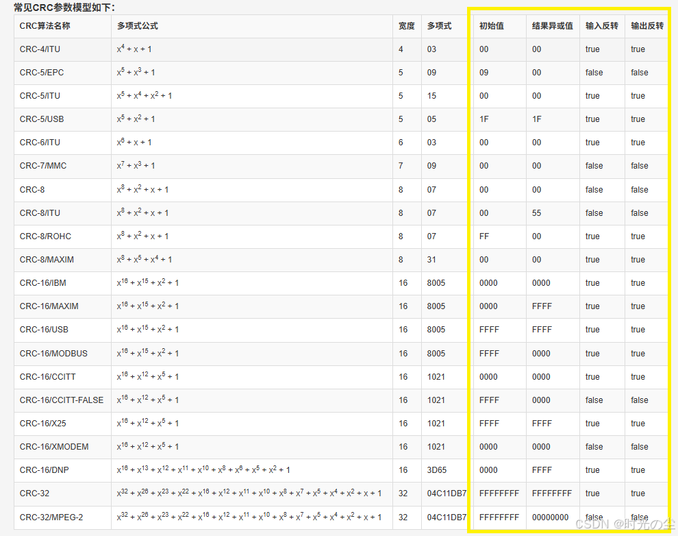 下面是一些常见的CRC参数模型,可能你发现了,除了我们上面提到的,还有四个名词没有使用到,即初始值、结果异或值、输入反转、输出反转: