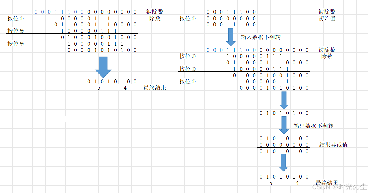以上就是CRC相关简单的运算过程,下面我们做一些拓展。注意拓展的这四个名词是为嵌入式单片机服务的,如果只是单纯的使用CRC计算,上面这些就可以了。