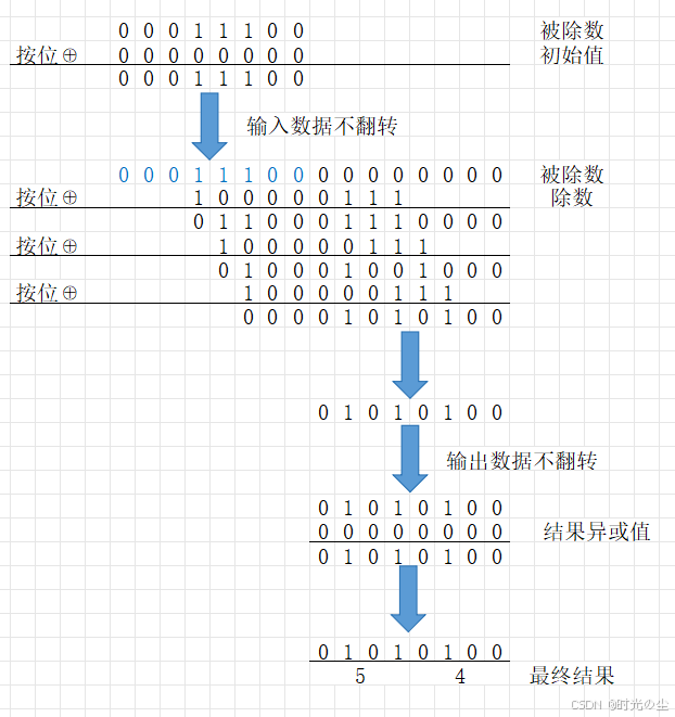 处理第0位(0): CRC最高位0 ^ 0 = 0 → 00101010 << 1 = 01010100
