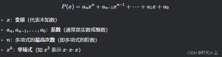 一个多项式是由变量(如 x)和系数(常数)通过加法、减法、乘法及非负整数次幂运算构成的表达式。