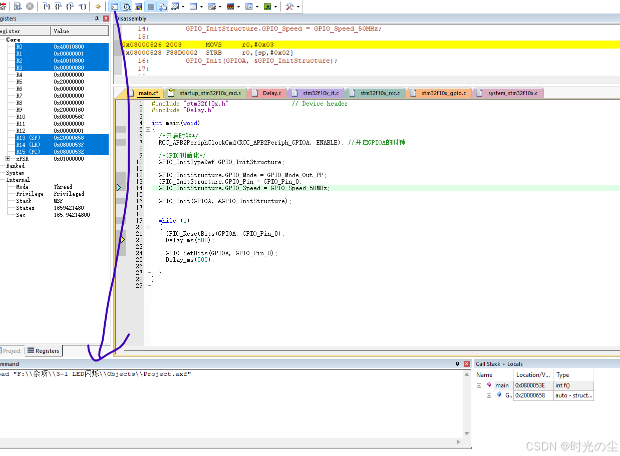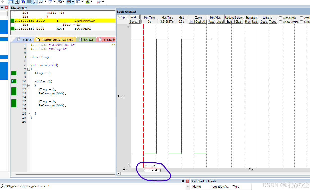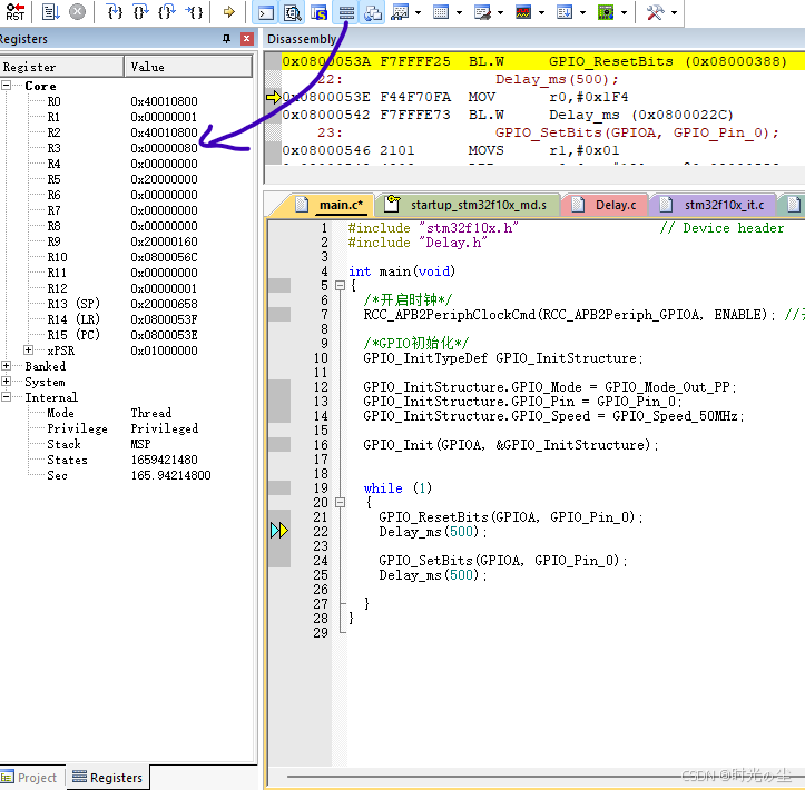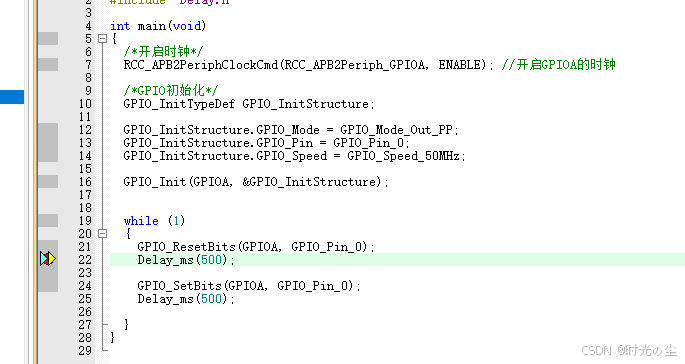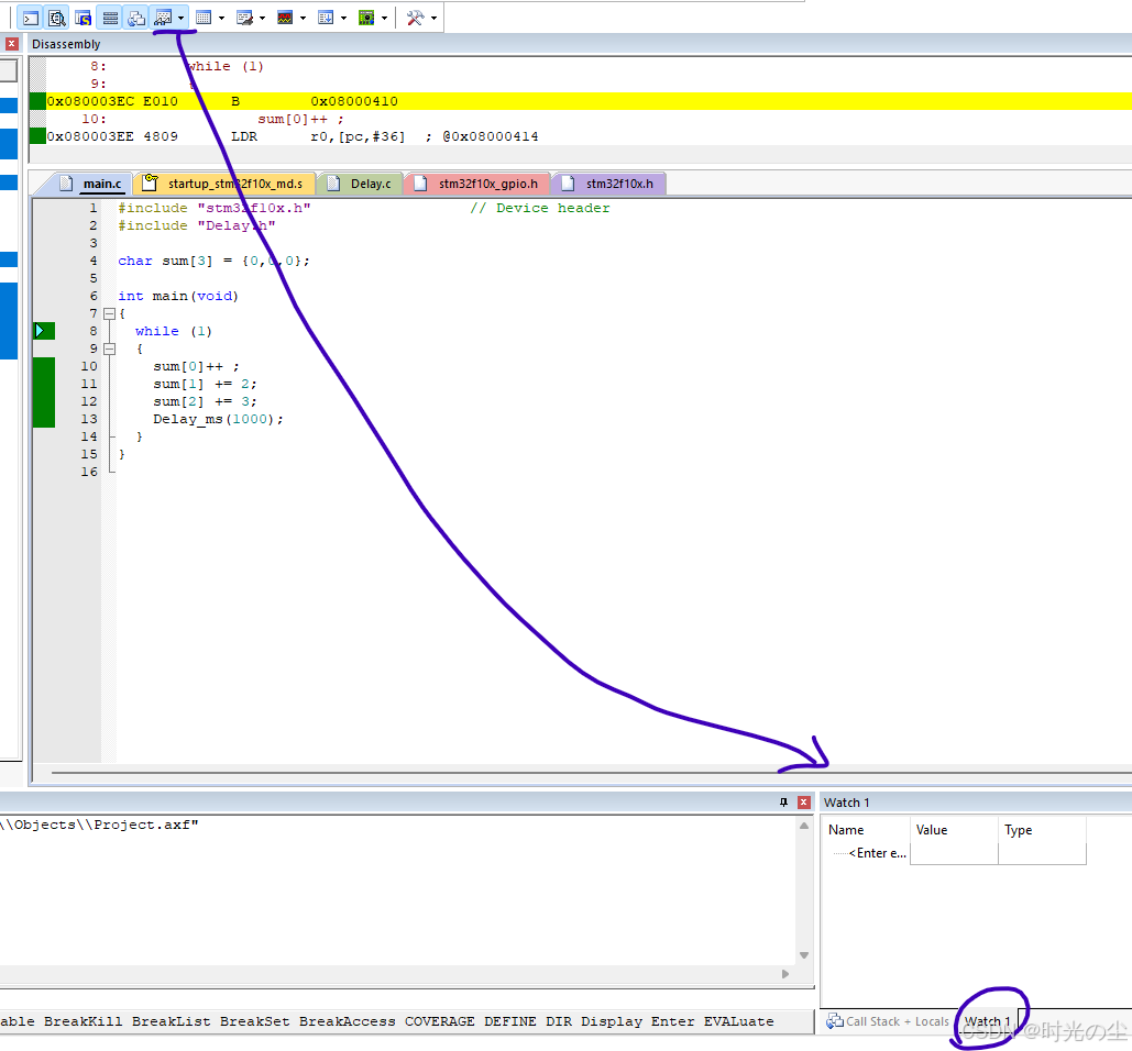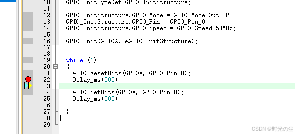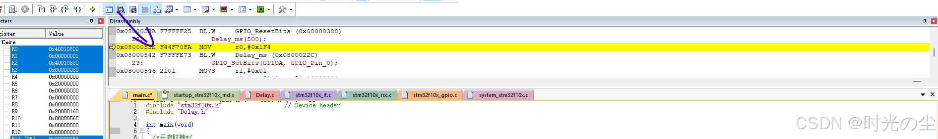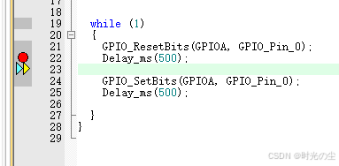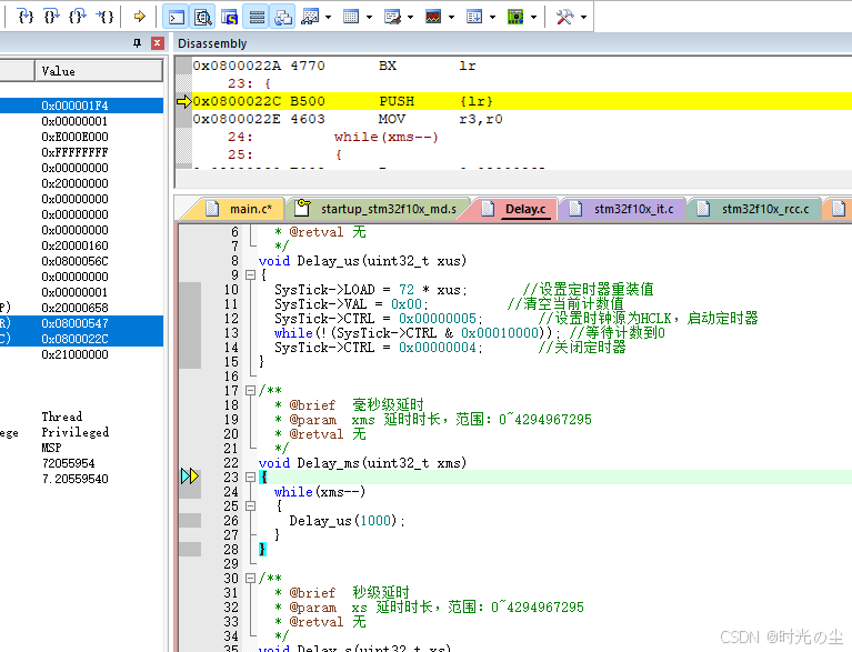 此时我们点击直行过去,会发现函数来到下一行,没有在进入到延时函数内: