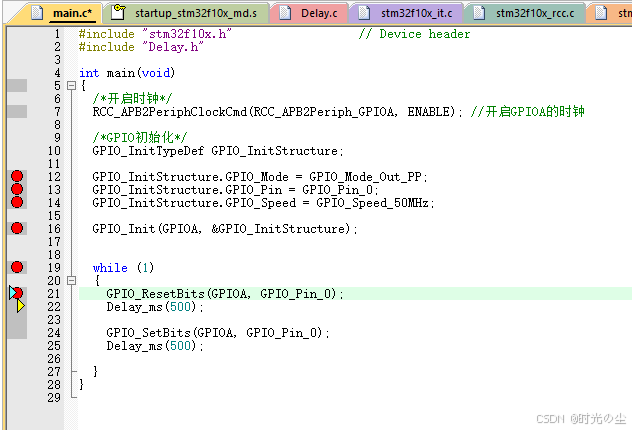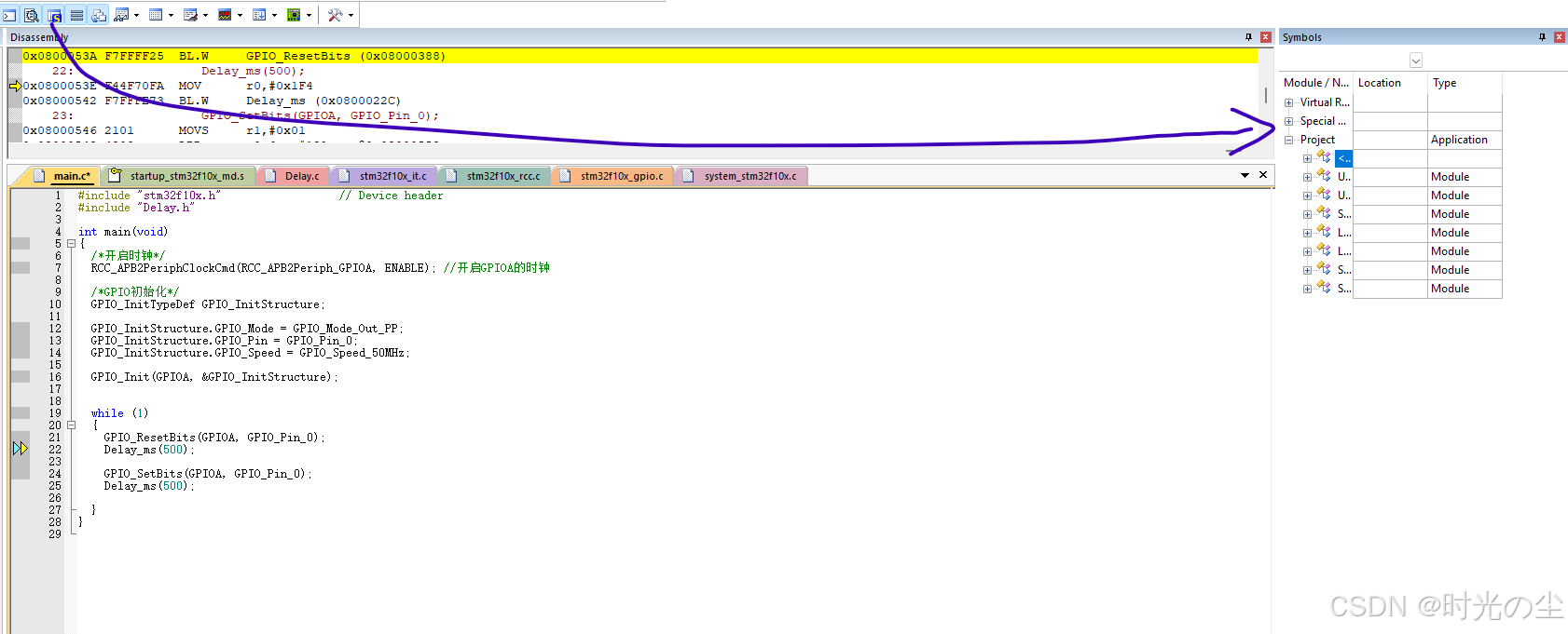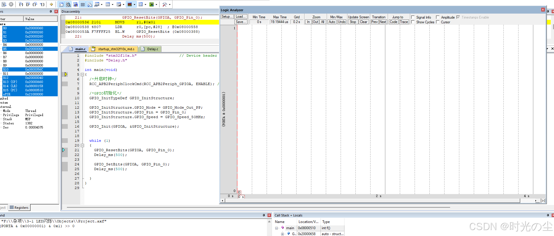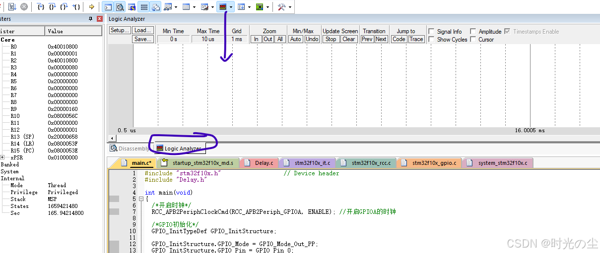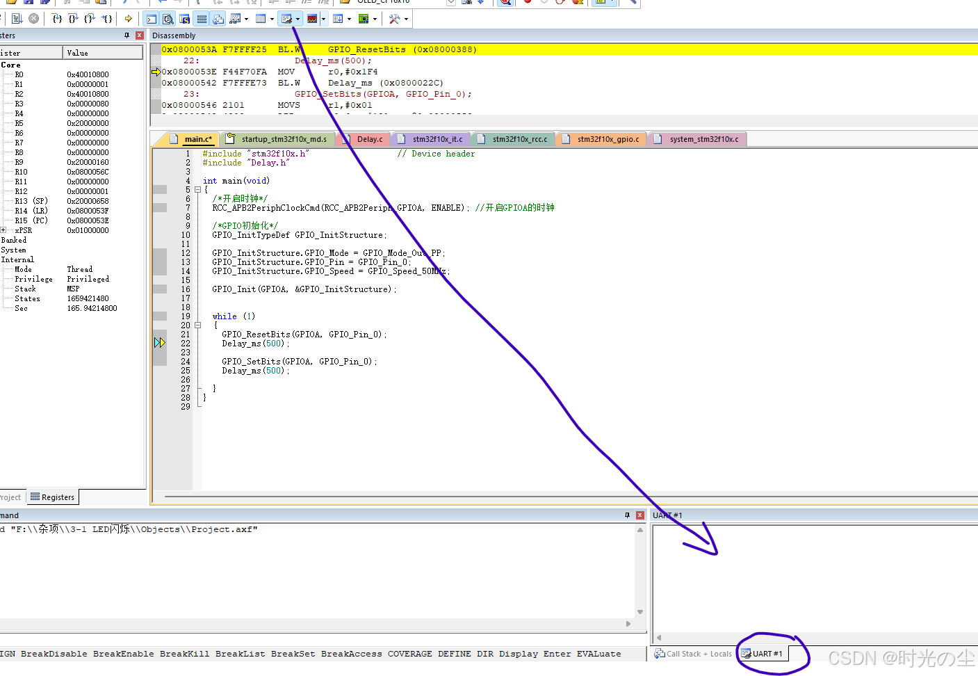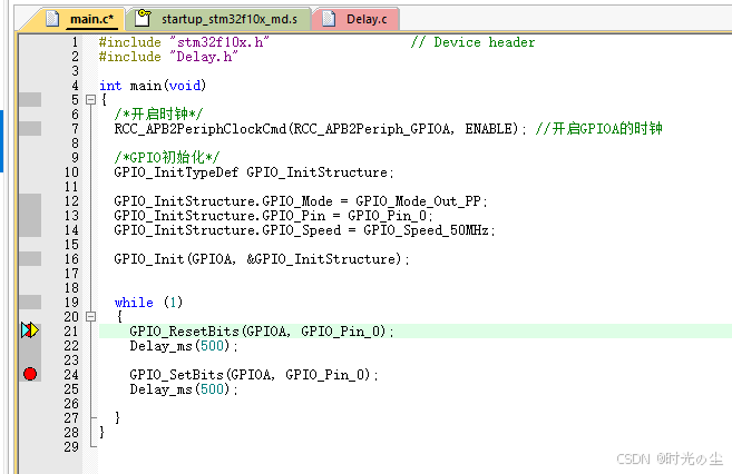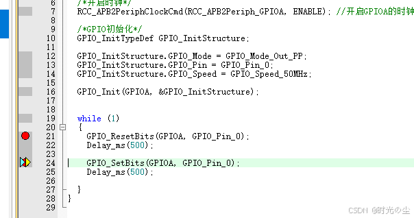 此时我们点击直行过去,会发现函数来到下一行,没有在进入到延时函数内: