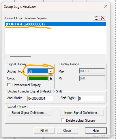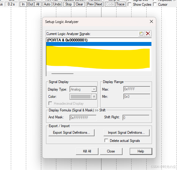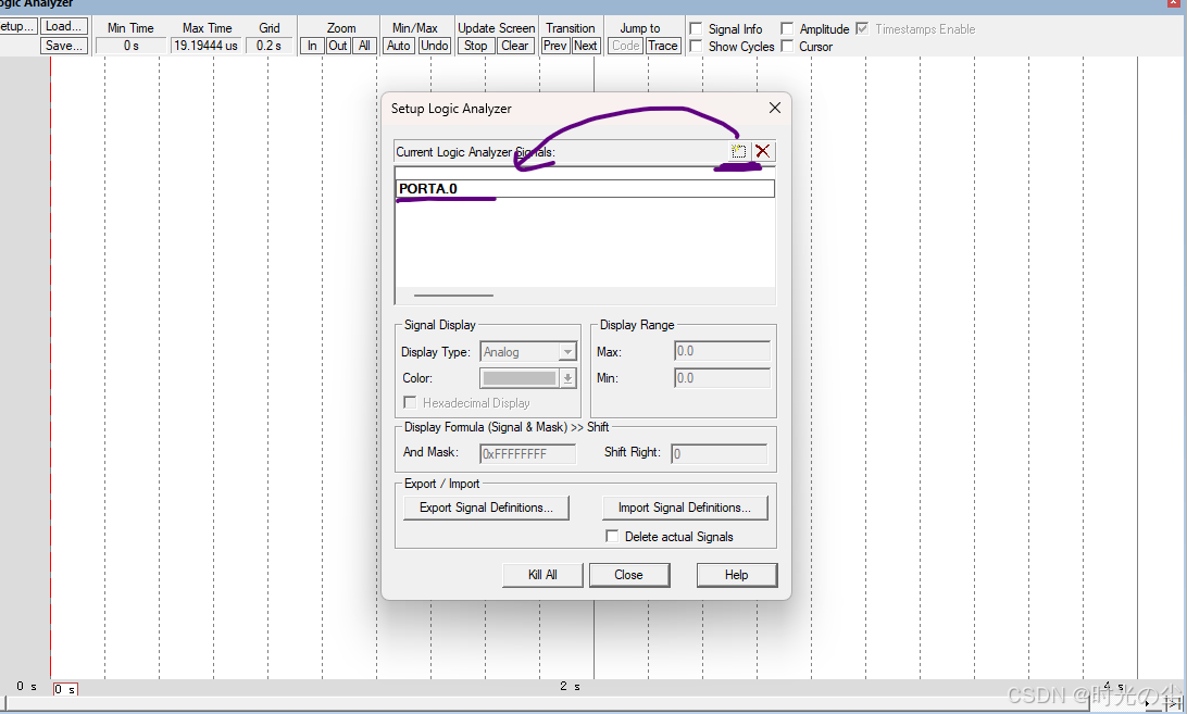 找到方块,点击,输入PORT+当前引脚通道+GPIO位置,例如我们此时想要测,PA0引脚,就需要输入 PORTA.0,如下图: