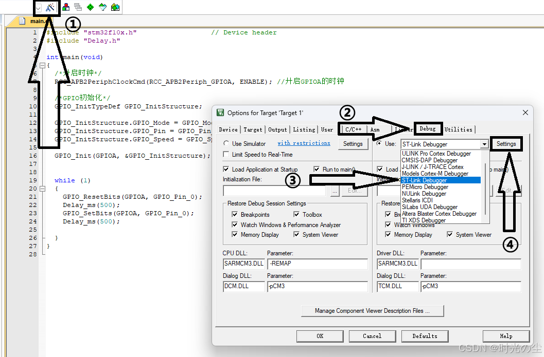 在开始使用仿真调试之前,先看下一下配置,按照如下步骤,找到魔术棒图标(①)点击,弹出界面后找到“debug”(②),而后找到自己所使用的下载器,这里我使用的是ST-Link,因此选择了“ST-Link Debugger”(③),然后找到“Settings”(④):