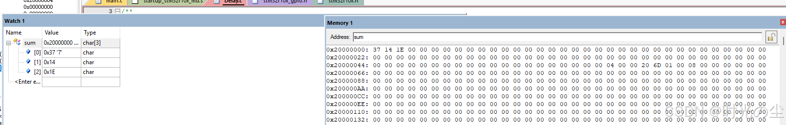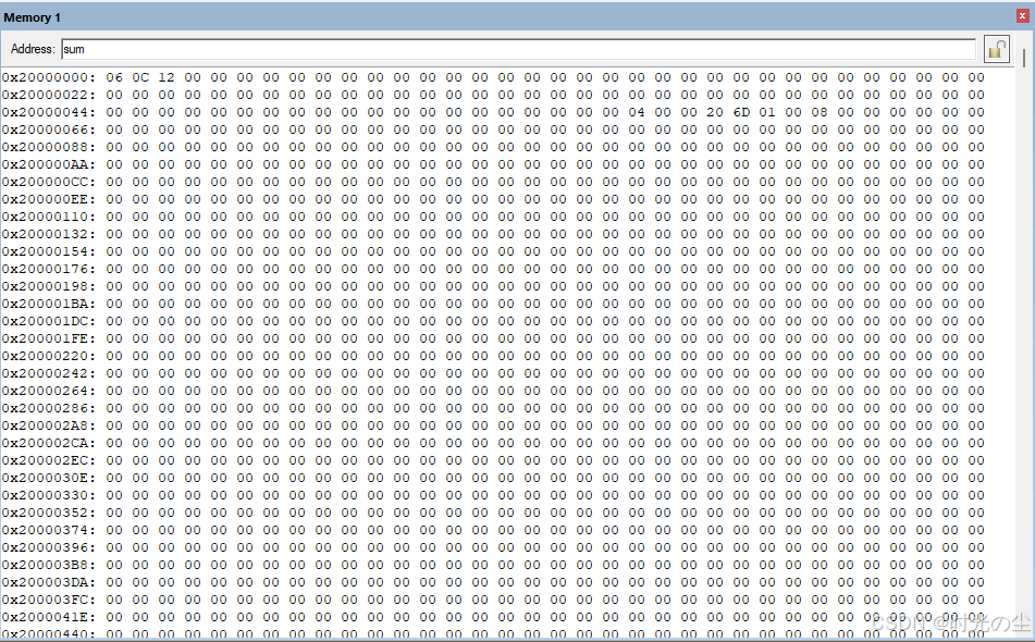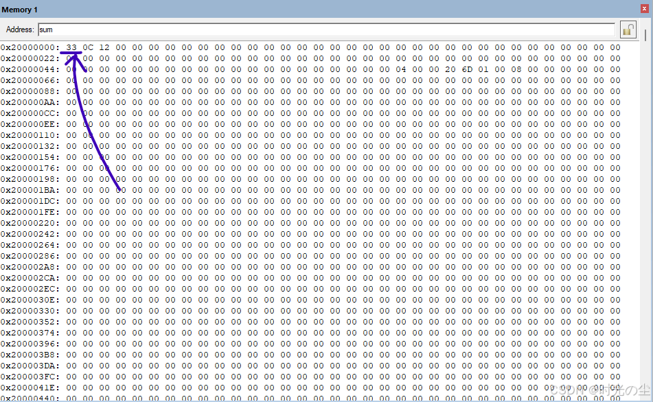 我们也可以对所在地址的值进行修改,例如把sum[0]的数据改为0x33,双击要修改的地址的数据,直接修改即可: